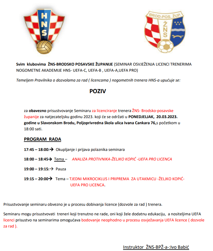 Upućen je poziv svim klubovima ŽNS-BRODSKO POSAVSKE ŽUPANIJE , a tema i razloga poziva je SEMINAR OSVJEŽENJA LICENCI TRENERIMA NOGOMETNE AKADEMIJE HNS-